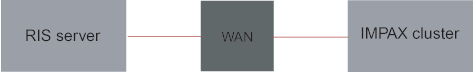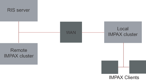 In the previous example, the local IMPAX cluster is situated at the main site where modalities send studies to it and the IMPAX Clients connect directly to it. The remote IMPAX cluster is situated remotely from the site but near the RIS server and no studies are sent to this cluster or IMPAX Clients do not connect to it.