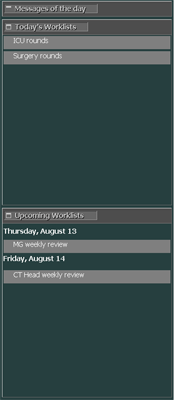 The At-a-Glance area in the List area of the IMPAX Client serves two main purposes. Your site may use it to communicate information about upgrades, holidays, company news, and so on. Scheduled worklists are also displayed, both for today and upcoming dates.