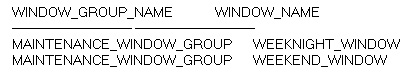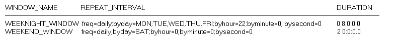 select window_name, repeat_interval, duration from dba_scheduler_windows where window_name in ('WEEKNIGHT_WINDOW', 'WEEKEND_WINDOW');