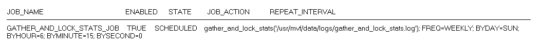 select job_name, enabled, state, job_action, repeat_interval from dba_scheduler_jobs where job_name like 'GATHER_AND_LOCK_STATS_JOB';