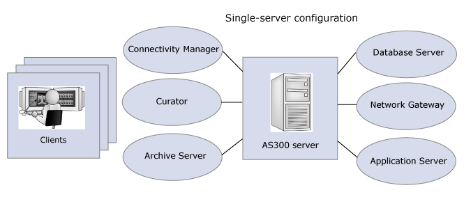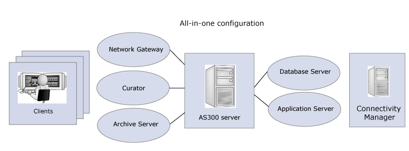 In an all-in-one server configuration, all AS300 Server and Application Server components are installed on the same Windows computer with an Oracle for Windows database.
